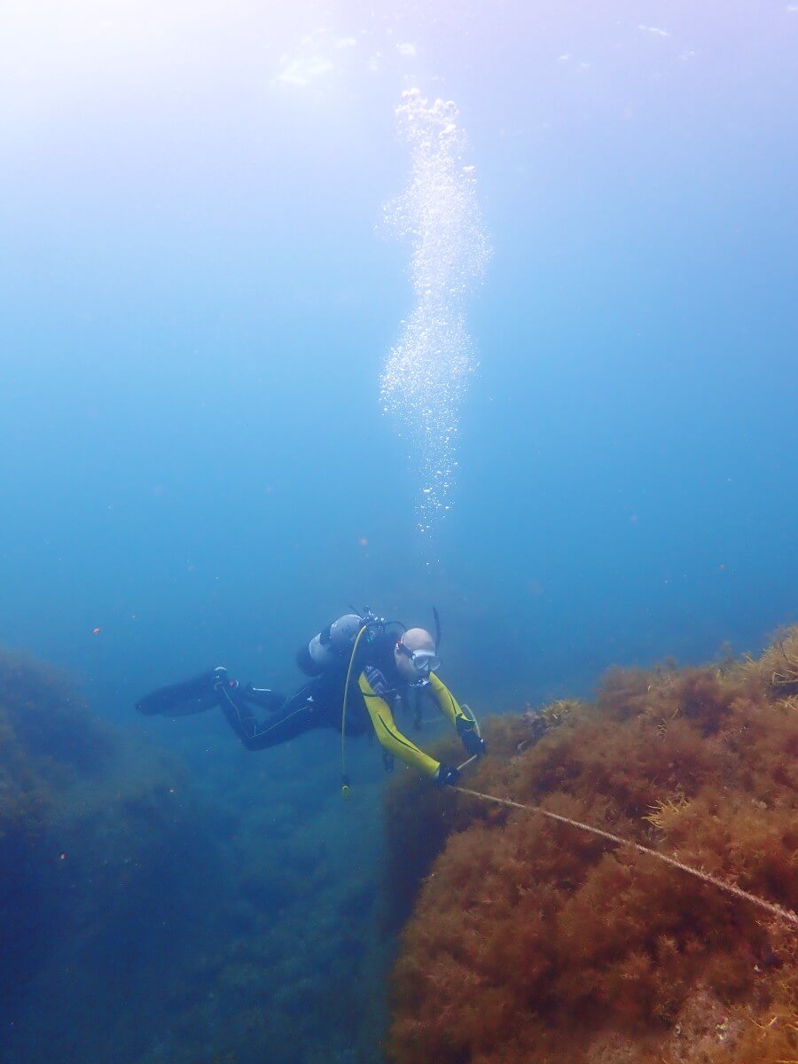 沖からのウネリが浮遊物を運んできている影響で海中は白っぽく感じますが10mくらいは見えていますので透明度は十分!