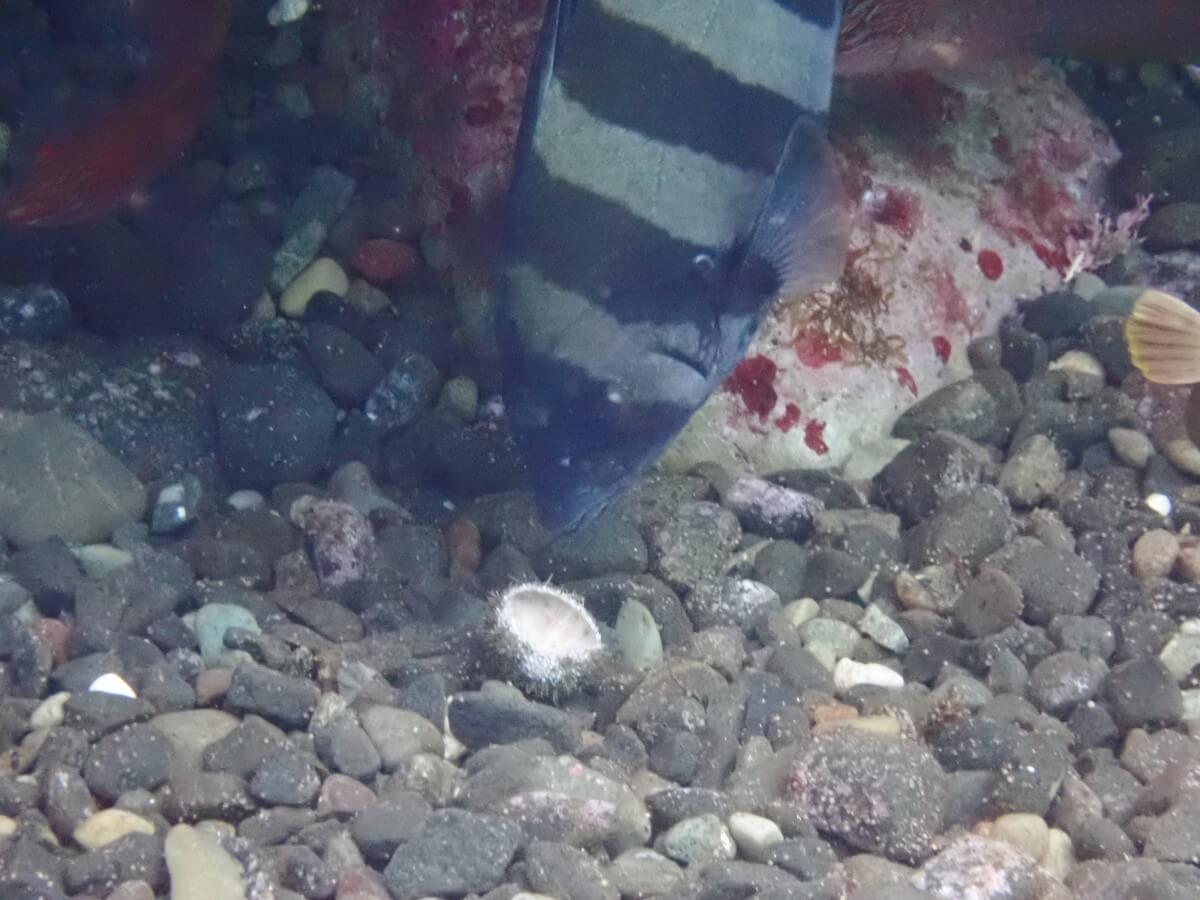 それに、周りを泳いでいるキュウセンやホシササノハベラといったベラ科のサカナ達やカワハギなどを追い払って独り占めしているので、イシダイの越前海岸での食物連鎖(=弱肉強食)ピラミッドの立ち位置的には上位に君臨しているみたい!