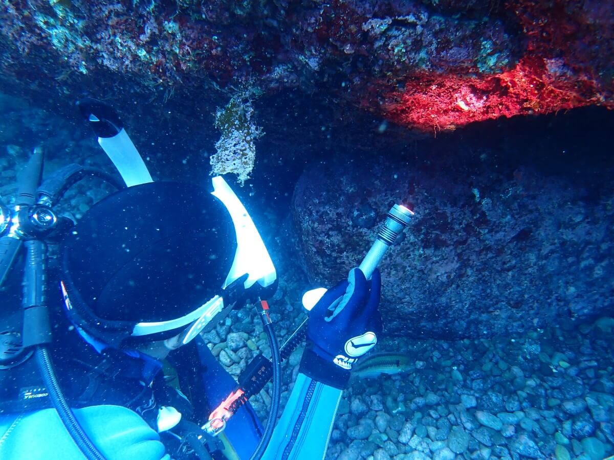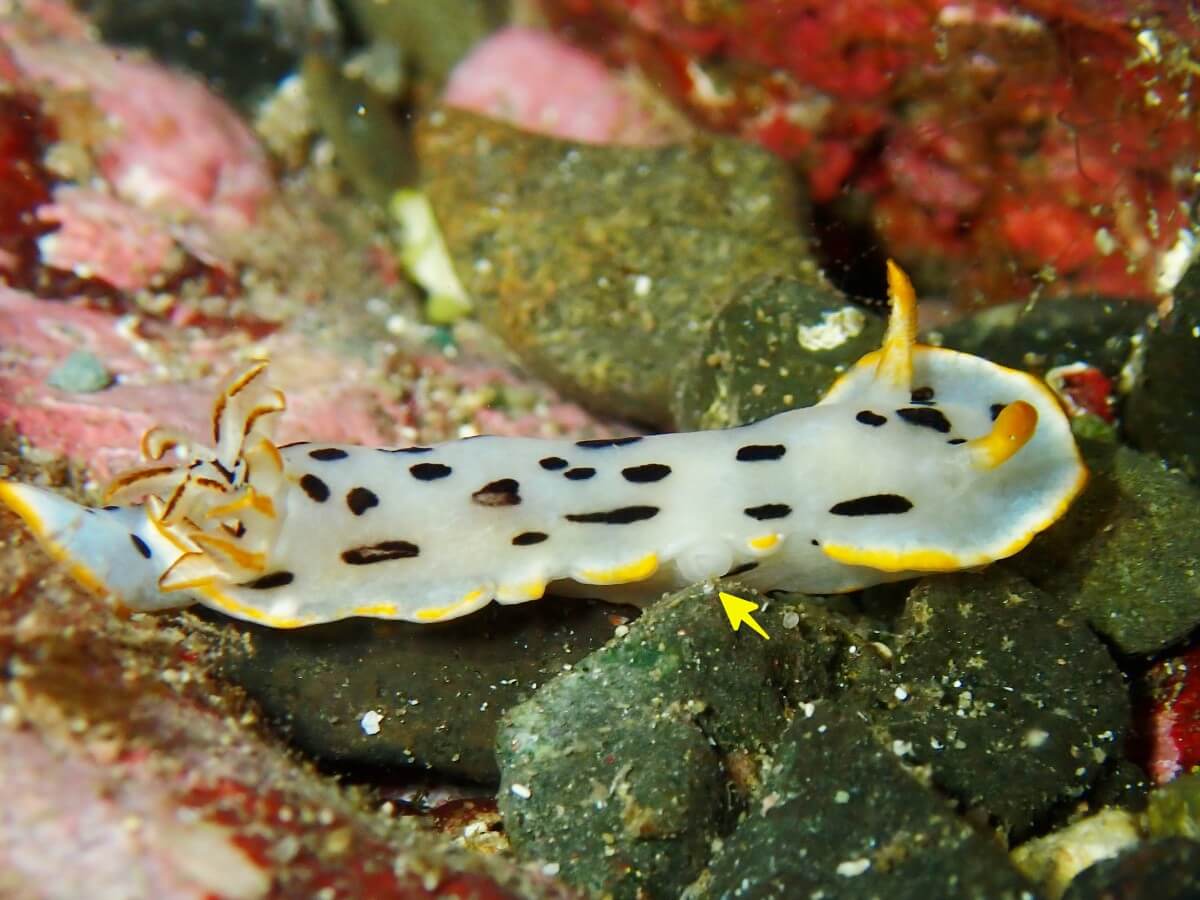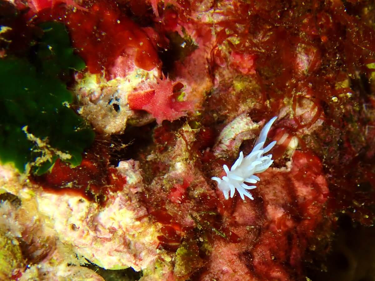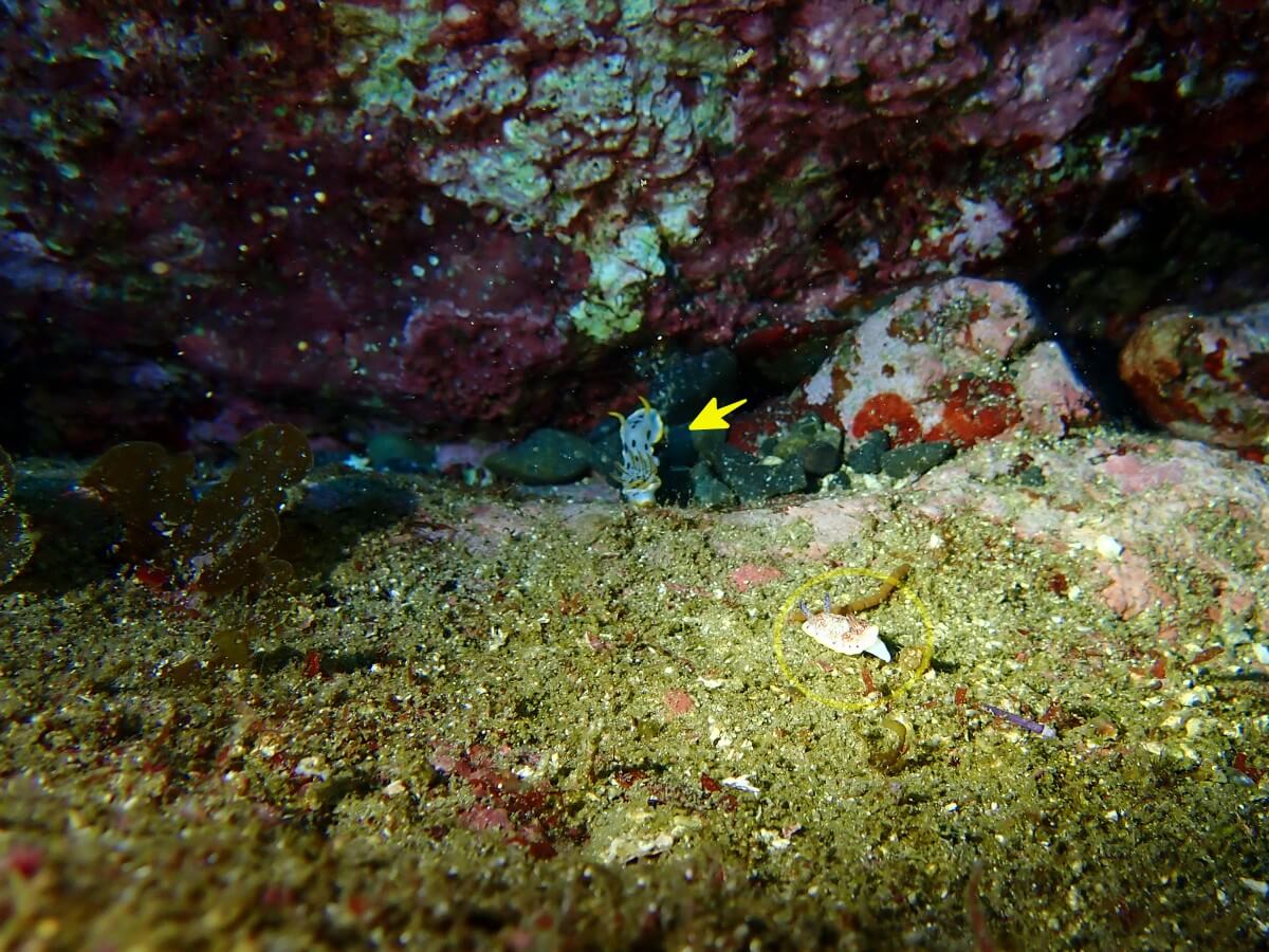 水中ライトで照らしながら生きもの達を探していると「体の側面が気になるシロウミウシ」と出会えました!