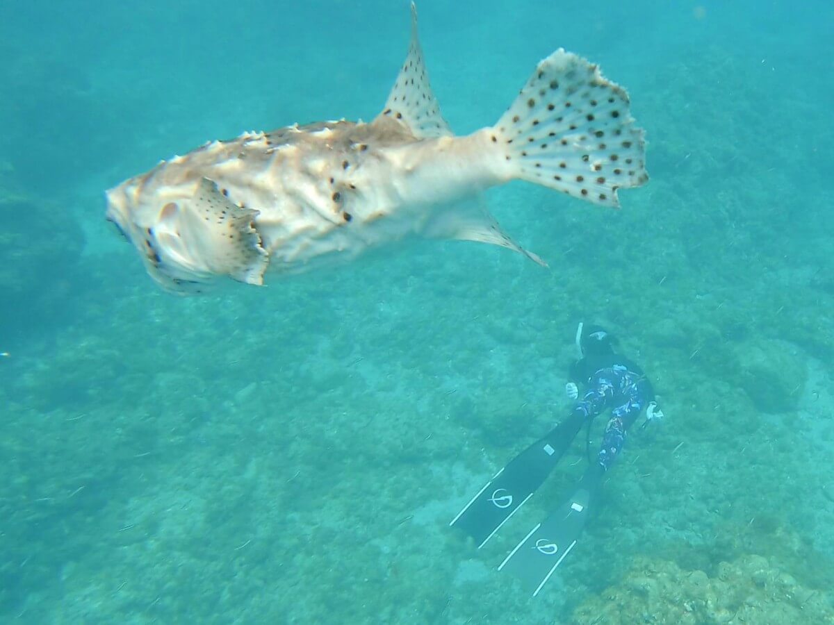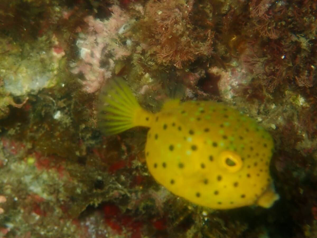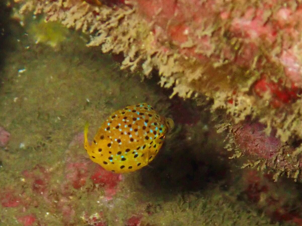 最初は「ミナミハコフグ」かなと思ったのですが「青白い斑点」が確認できますので「ハコフグ幼魚」で間違いなさそう。