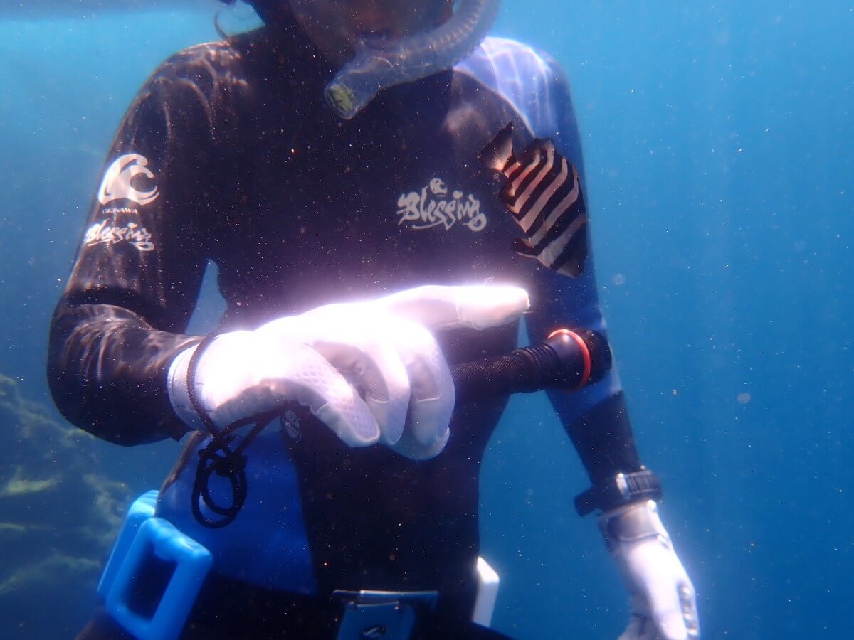 今年のヒリゾ浜は水温にバラつきがあるみたいで水面は27℃と温かい場所もありましたが、ちょっと(水深2mくらい)潜るだけでヒヤッとしちゃいました!