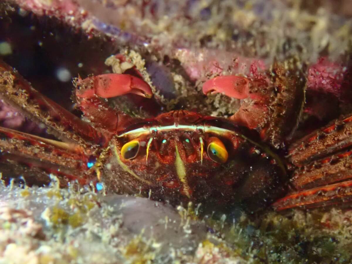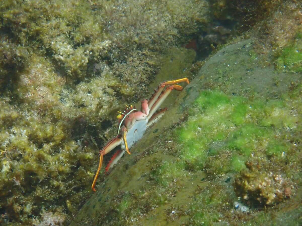 早速、生きもの探しを始めて見ると、僕が太平洋側に泳ぎに来たら出会いたいカニの1種「トゲアシガニ」を発見!