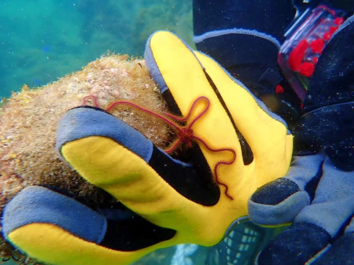 でも、クモヒトデ科の仲間は「暗い転石裏などを好む」生きものなので、1人でセルフ撮影しようにも石と手のすき間に潜りこんでくるので全く撮れる気配が無い…