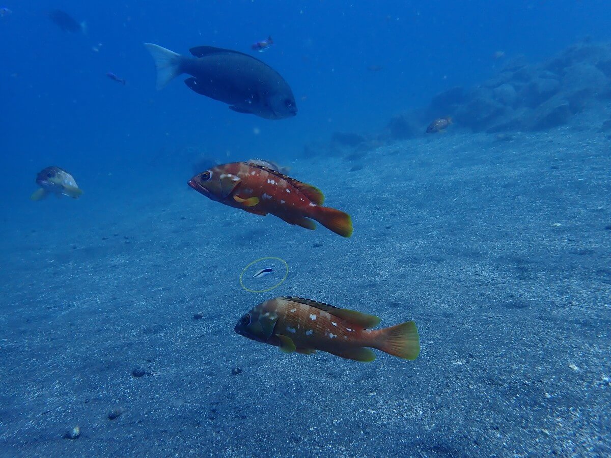 早速、潜ってみると「アカハタ」が適度な距離感で並ぶ(=ソーシャルディスタンスしているような)光景を目撃しました!