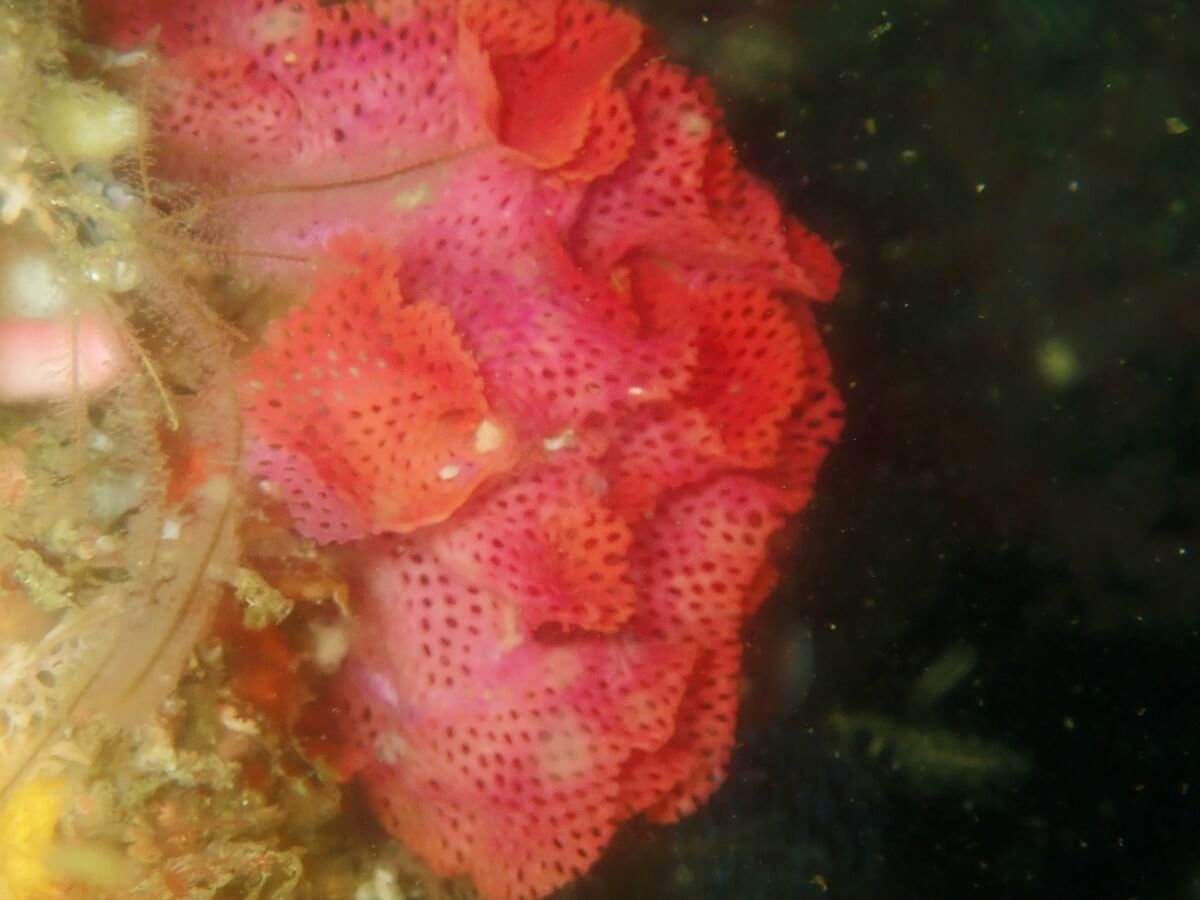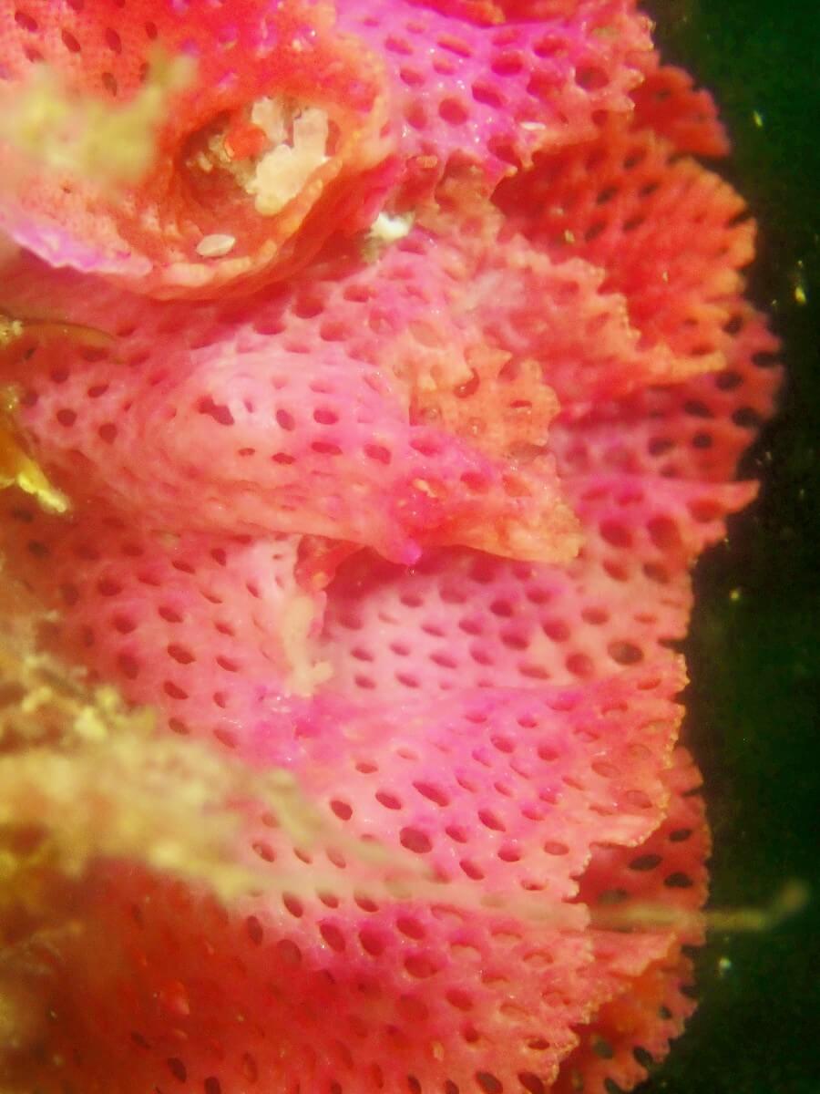 このピンク色で鮮やかな海藻みたいなのは「ベニアミコケムシ」。