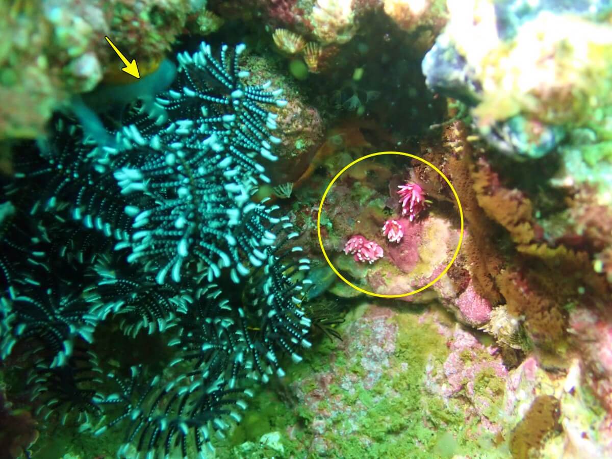もし、そうだとしたら「ウミウシ類は偏食の子が多くエサを見つけるだけでも大変」なので、エサとなる「ピンク色~赤色のコケムシ」が無事に見つけることを祈るのみ!