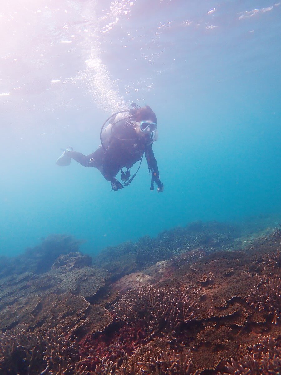 Mさんは串本のうみを潜るのが初体験なので、先ずは赤鯱前が誇るサンゴ群生地をのんびり水中探検♪